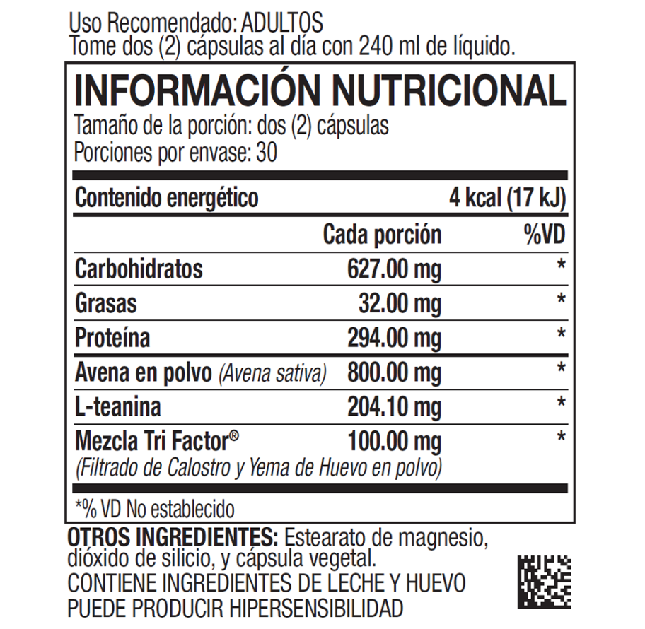Un producto específicamente diseñado para complementar y apoyar tu bienestar general con una mezcla única de ingredientes naturales que incluye L-Teanina, avena verde silvestre y los beneficios de la mezcla Tri-Factor® Formula.
